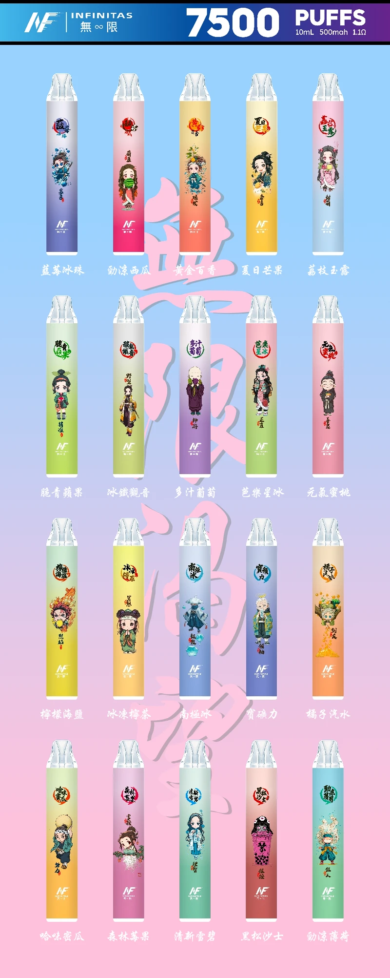 以《鬼滅之刃》角色為設計靈感,拋棄式小煙每一款都有獨特的角色主題色調與圖騰,收藏價值高!